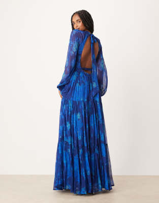 Dresses by Lace & Beads Floral design Tie-fastening high neck Pleated details Blouson sleeves Tie waist Open back Tiered skirt Relaxed fit