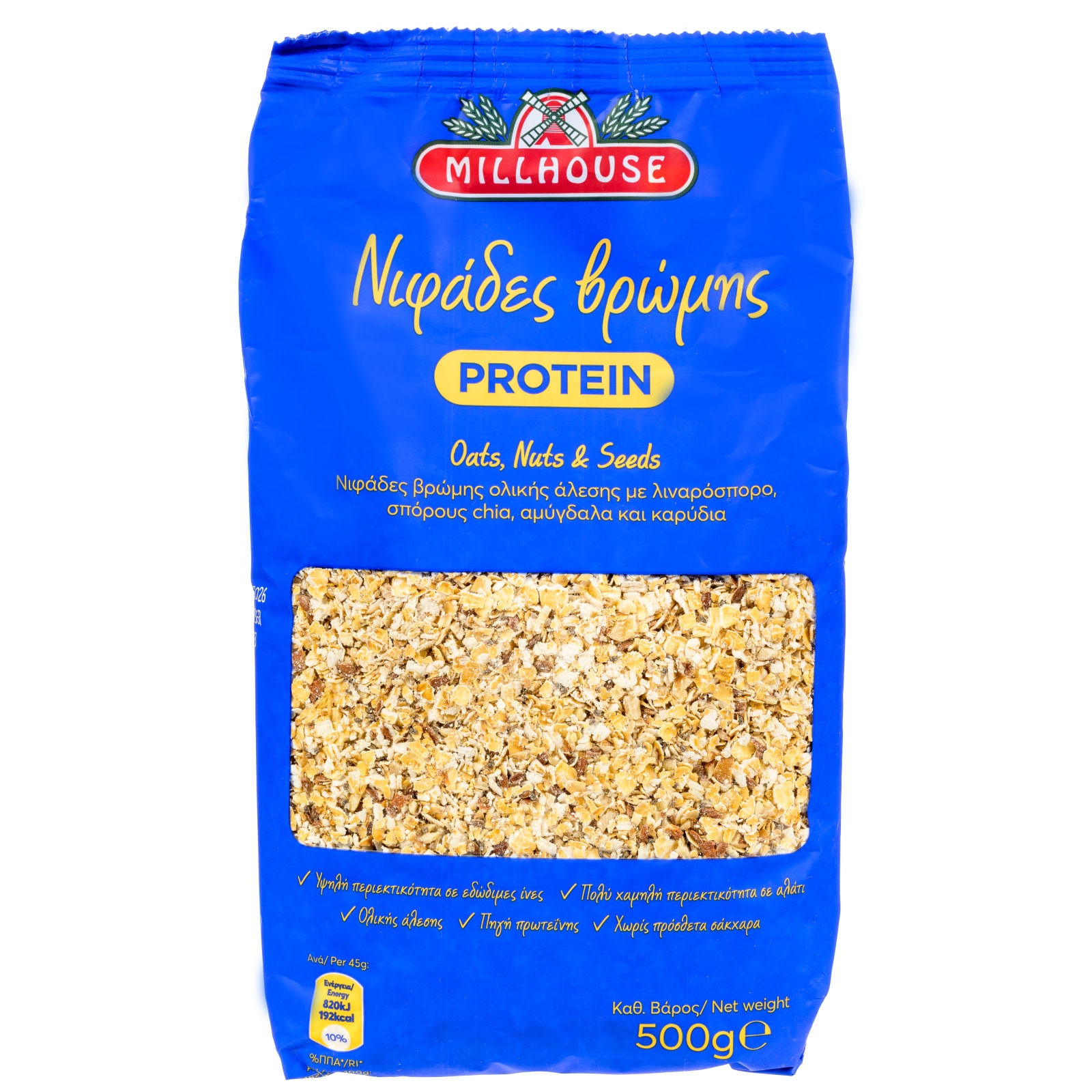 Οι Νιφάδες Βρώμης PROTEIN Nuts & Seeds MILLHOUSE είναι οι κλασικές, αυθεντικές νιφάδες βρώμης ολικής άλεσης που όλοι αγαπάμε εμπλουτισμένες με μείγμα ξηρών καρπών και σπόρων! Λιναρόσπορος, σπόροι chia, αμύγδαλα και καρύδια είναι τα συσταικά που την καθιστούν σε ένα ακαταμάχητο γεύμα φυσικής πρωτεΐνης.