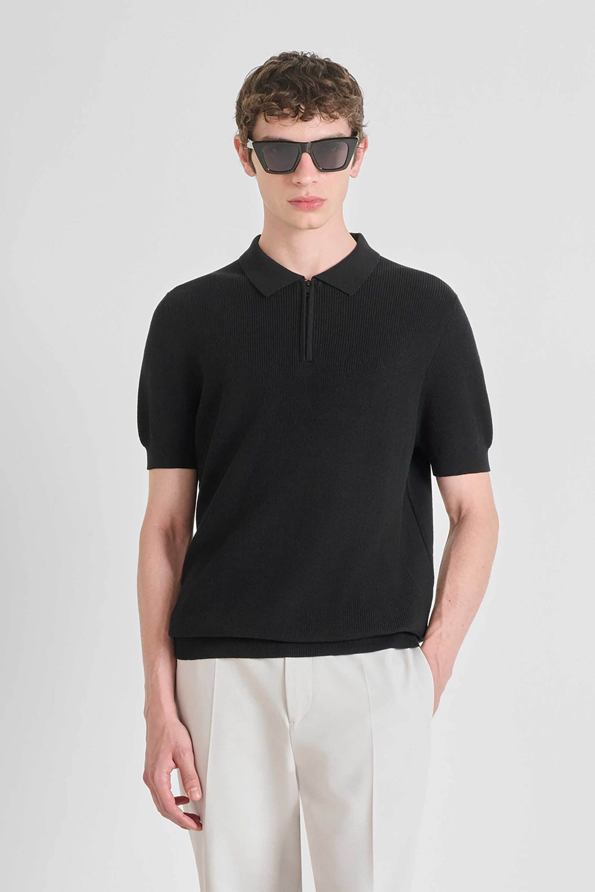 Aνδρική πλεκτή μπλούζα. Πόλο γιακάς με φερμουάρ. Κοντό μανίκι. Ribbed. Moνόχρωμη. Regular fit. Προέλευση: Κίνα. 100% βαμβάκι SHOP & TRADE AEBE