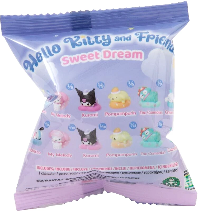 Hello Kitty Φιγούρα Sweet Dream 4cm-12 Σχέδια-1Τμχ (HKT35000). Hello Kitty & Friends – Sweet Dream Series Συλλεκτικές Φιγούρες 4 εκ. Βυθιστείτε σε έναν ονειρικό κόσμο με τη συλλογή Hello Kitty & Friends – Sweet Dream! Οι αγαπημένοι χαρακτήρες της Sanrio απολαμβάνουν τη χαλάρωσή τους ξαπλωμένες πάνω σε ""αφράτα"" σύννεφα, έτοιμοι για έναν γλυκό ύπνο. Συλλεκτική σειρά με 12 διαφορετικά σχέδια μίνι φιγούρων 4 εκ. 6 Regular και 6 Special φιγούρες για να ανακαλύψετε, στις special φιγούρες το συννεφάκι ειναι χνουδωτό! Blind Box (σακουλάκι) : Η φιγούρα που θα αποκτήσετε είναι έκπληξη! Ονειρικό παστέλ design που ταιριάζει τέλεια σε κάθε συλλογή Στη συλλογή θα βρείτε τους χαρακτήρες: Kuromi, My Melody, Hangyodon, Cinnamoroll, Pompompurin, Pochacco. Ιδανικό για συλλέκτες και λάτρεις της Hello Kitty & Friends! Προσθέστε λίγη kawaii μαγεία στη μέρα σας με αυτή τη χαριτωμένη σειρά! Η επιλογή σχεδίου θα γίνεται τυχαία
