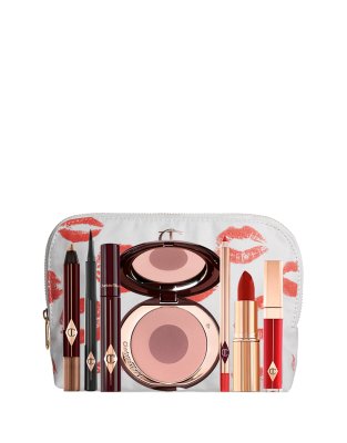 Makeup set by Charlotte Tilbury Next stop: checkout Contains seven full-size products and a makeup bag Includes everything you need to create 'The Bombshell Look': eyeshadow pencil mascara eyeliner blusher lip liner lipstick and lipgloss Branded lip-print makeup bag Product is non-returnable for hygiene reasons
