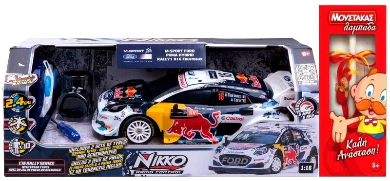 Nikko Τηλεκατευθυνόμενο Ford Puma Hybrid Rally 1 M-Sport 1:16 (10661). Χαρακτηριστικά: Πλήρης λειτουργία Ραδιοσυχνότητα: 2,4GHZ Πολυζωνικός αγώνας για 10 παίκτες