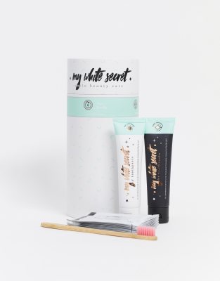 Dental Care Product by My White Secret Basket-worthy find Contains four products Day toothpaste is formulated to prevent stains and whiten teeth Night toothpaste helps take care of gums Whitening strips contain active charcoal to help delicately lighten teeth Bamboo toothbrush helps to remove plaque without harming enamel or causing sensitivity Features nylon bristles Product is non-returnable for hygiene reasons