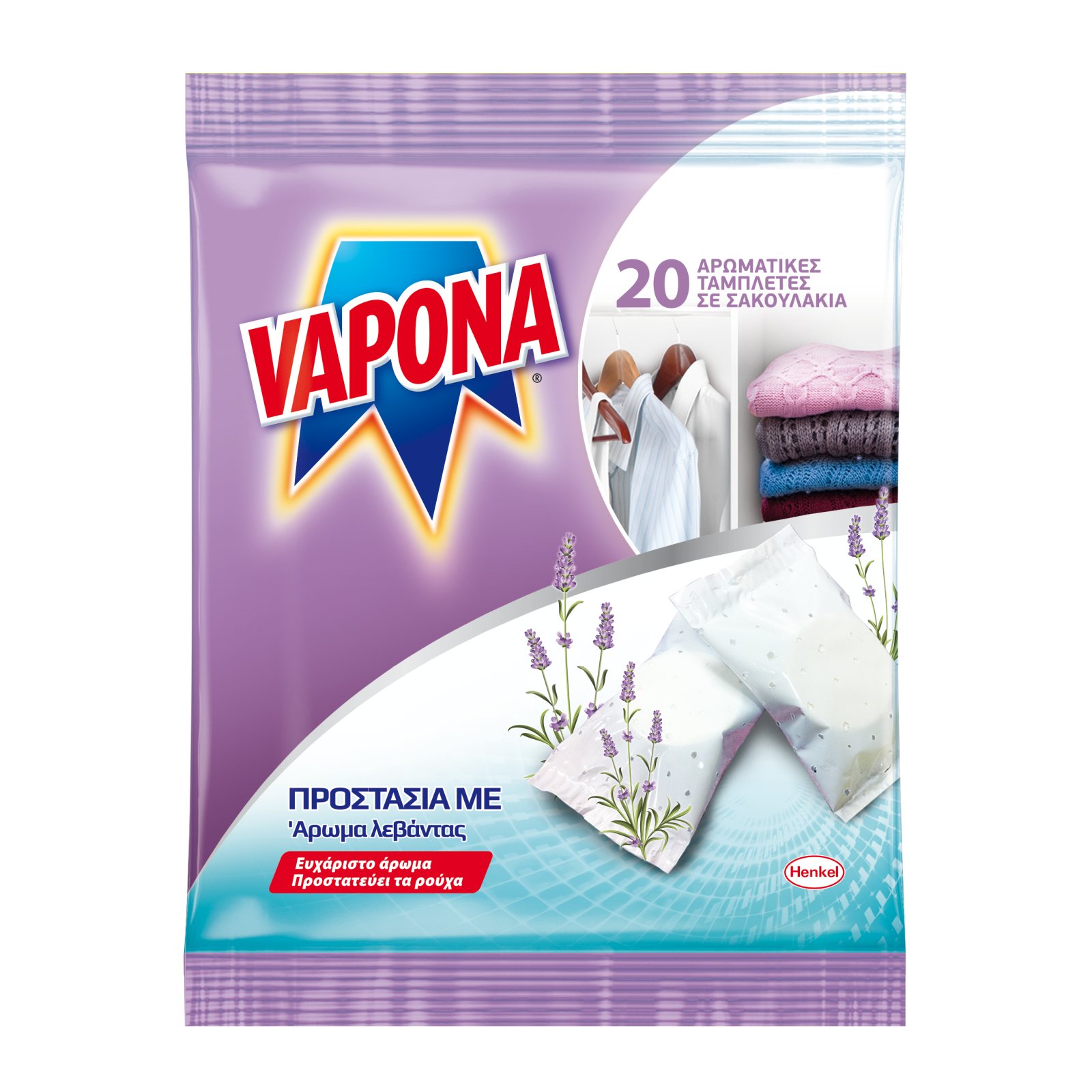 Οι Vapona ταμπλέτες σε σακουλακια με άρωμα λεβάντας προστατεύουν τα αγαπημένα σας ρούχα όλη τη σεζόν, αφήνοντας ένα απαλό άρωμα λεβάντας στην ντουλάπα σας.
