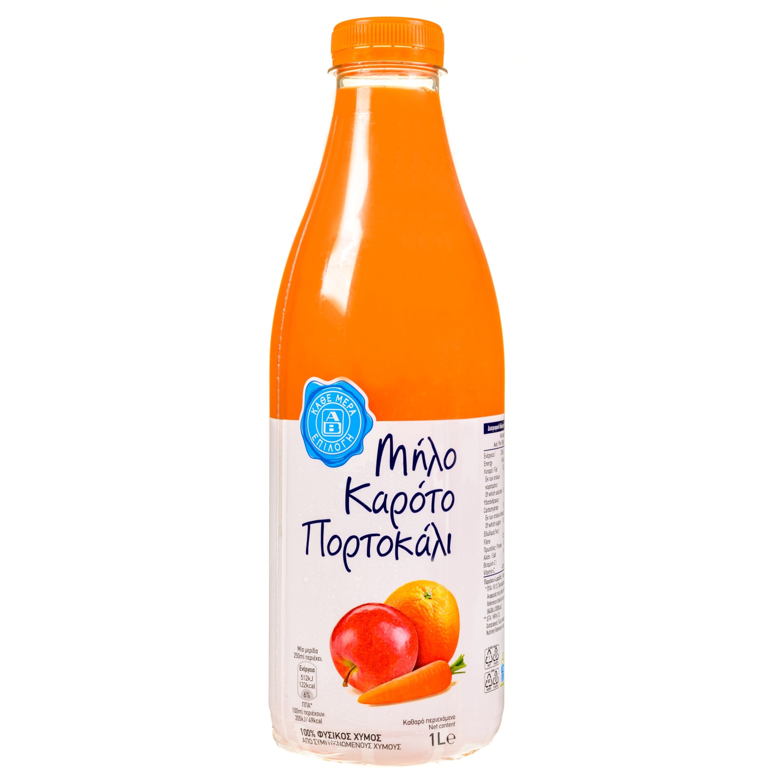 100% φυσικός χυμός μήλου, καρότου και πορτοκαλιού από συμπυκνωμένους χυμούς.