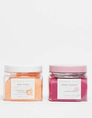 Face + Body by Sunday Rain Contains two body scrubs Designed to nourish and brighten skin Helps to soft and smooth skin Mango and Coconut and Rose scents Product is non-returnable for hygiene reasons