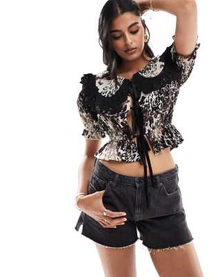 Tops by Miss Selfridge Stay on top off it Animal print Oversized collar Tie front Puff sleeves Regular fit