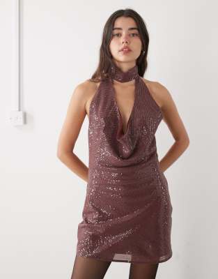 Dresses by Reclaimed Vintage Exclusive to ASOS Sequin embellishment High neck Cowl front Open back Buttoned halter neck Regular fit